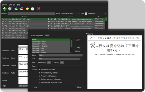 Unless you happen to stumble onto exactly the deck you need courtesy of other Anki users, you will eventually need to create your own decks of study cards. Anki includes a built-in, visual card editor. You can edit the decks you download from the Internet or create your own from scratch just as easily — simply click on the "Add Items" button in the toolbar to create a new card, or choose "Browse Items" to open up a window listing all of the existing cards.